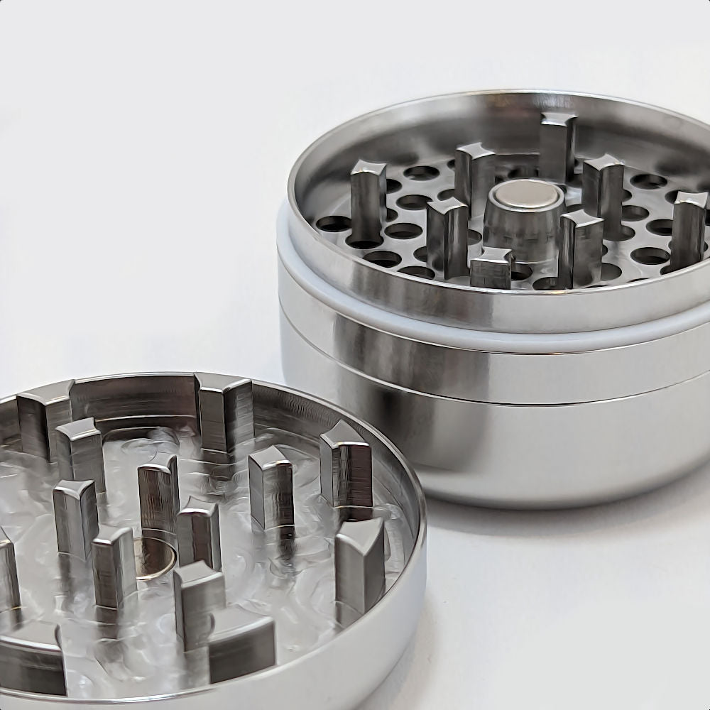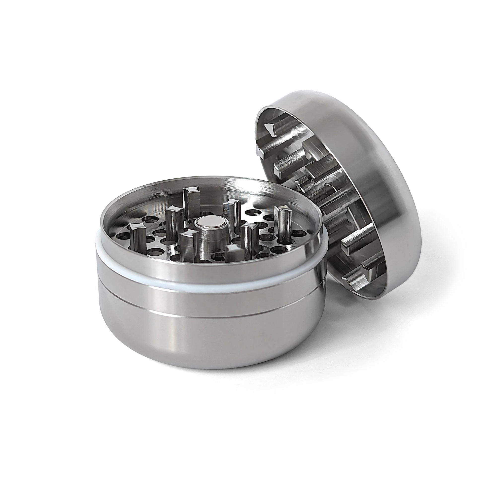 Stainless steel is stronger, harder, and more durable than aluminum. It will not chip and flake like aluminum does. Say goodbye to aluminum dust in your herb.